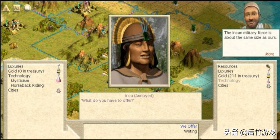文明系列是4X回合制游戏的代表,2001年的《文明3》为系列的辉煌奠定基础。玩家可以同和AI控制的各个领袖进行谈判,讨价还价,这也成为系列的标志玩法之一。谈判就是交易,覆盖金钱、物资、外交关系,当然最重要的是科技交换。不过为了平衡性,游戏在这方面对玩家多有惩罚,而AI却十分精明,玩家很难同他们进行公平的交换。