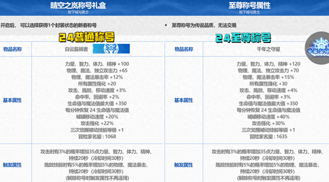 对比“24普通称号”,+100四维,+65三攻,+20全属强,+3%三速,+22%攻击强化,+1068名望值。
