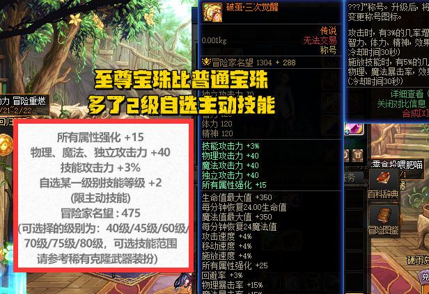 【2,至尊称号宝珠】+15全属强,+40三攻,+3%技攻,+2级主动技能,+475名望值。