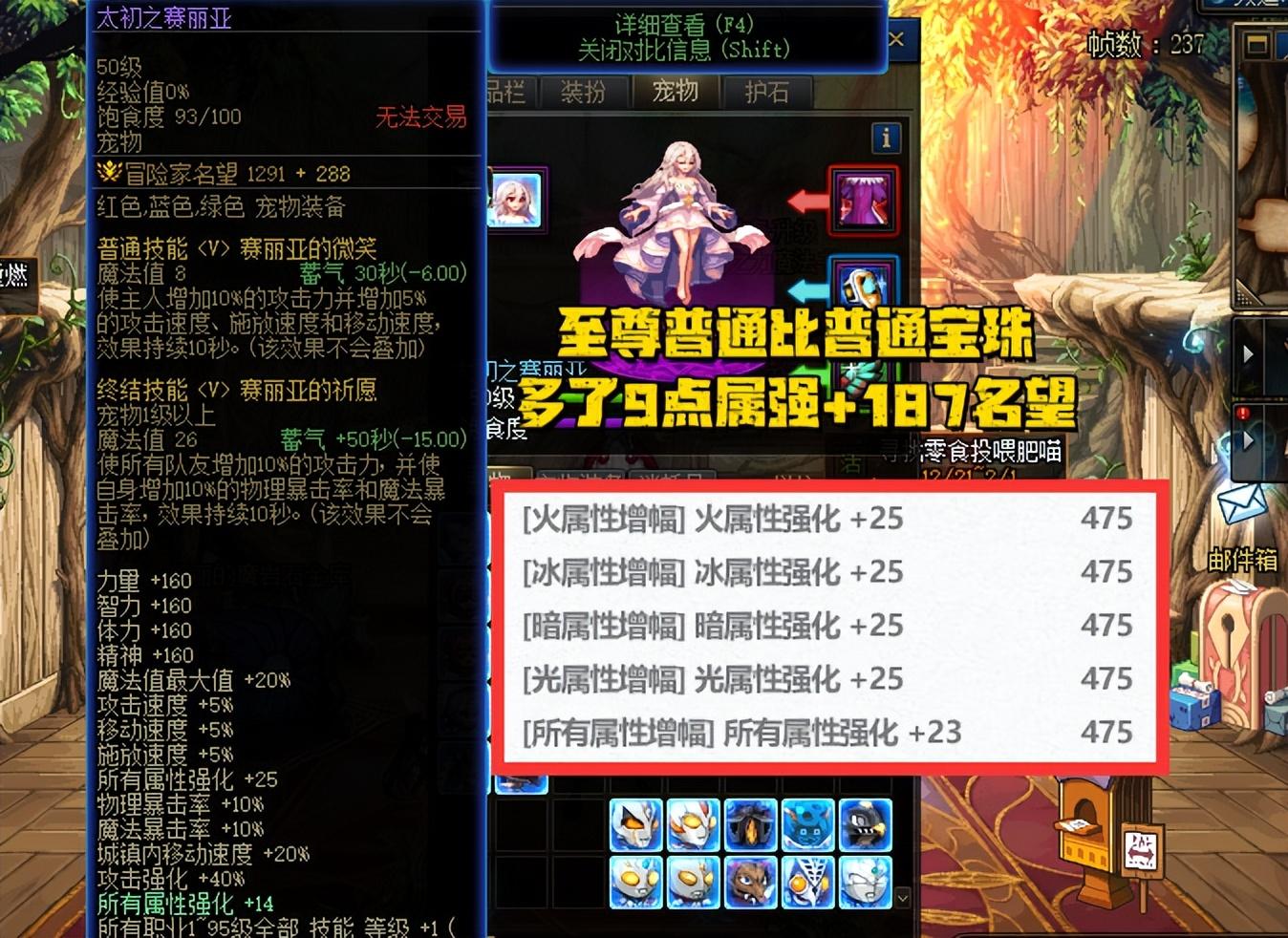 对比“普通宠物宝珠”,+16单属强,或者14单属强,+288名望值。