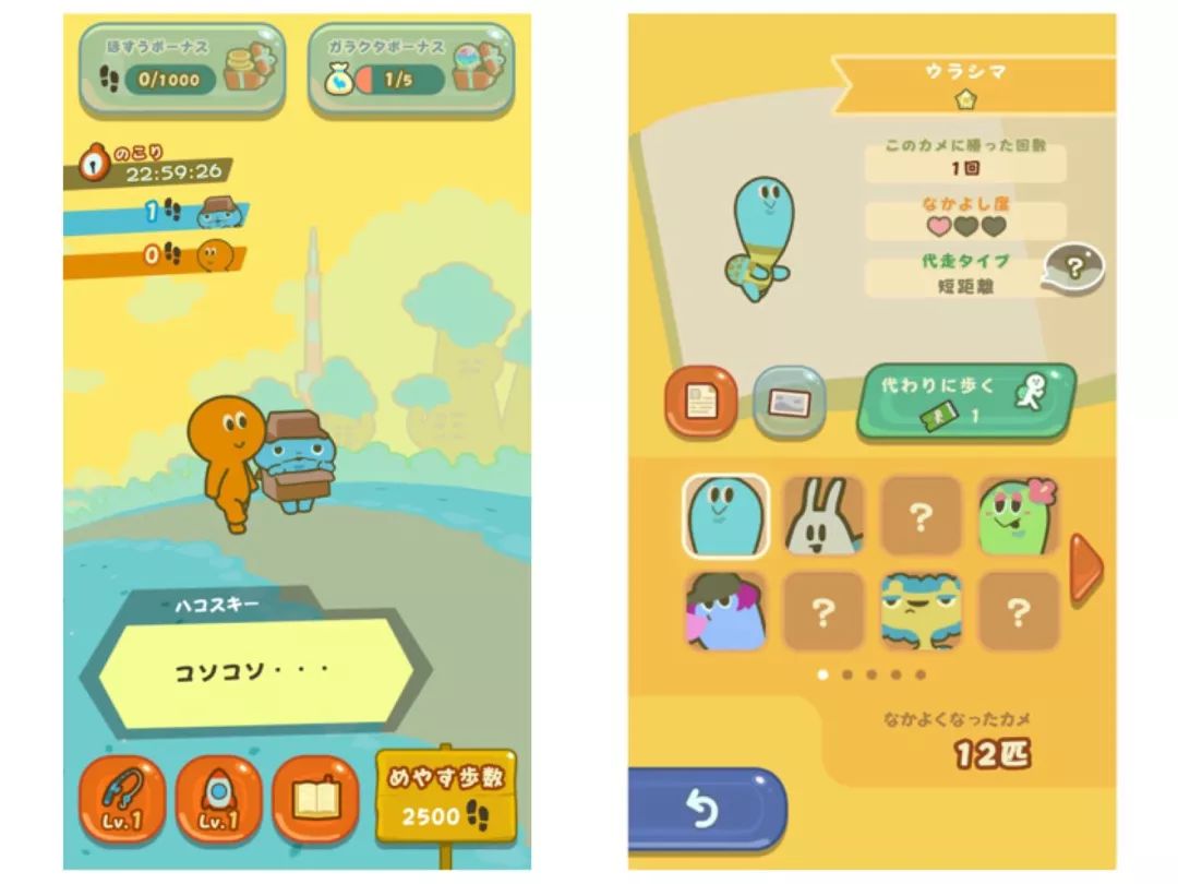 游戏画风非常地可爱,通过每日行走即可增加步数,在限定时间内赢过龟龟们即可招为伙伴。