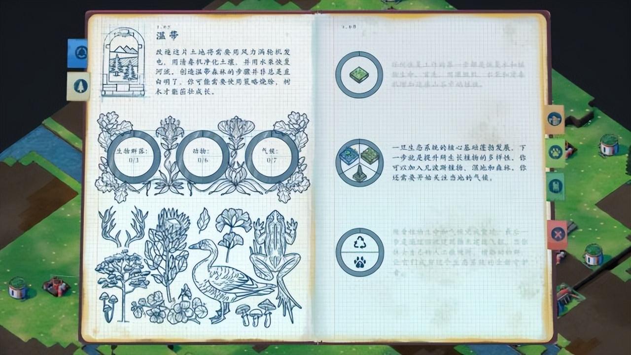 那么为啥最开始会评价“筑梦颂,但是环保模拟器”呢?原因在于本作和筑梦颂一样,同样是有一些借鉴桌游卡卡颂的地块玩法——比如树木地块汇聚到一定程度变成树林,树林就会产生鹿群这样居住于其中的动物,除了地块的累积以外,还可以和地形结合产生更多的变化,比如山上的树林变成山林。