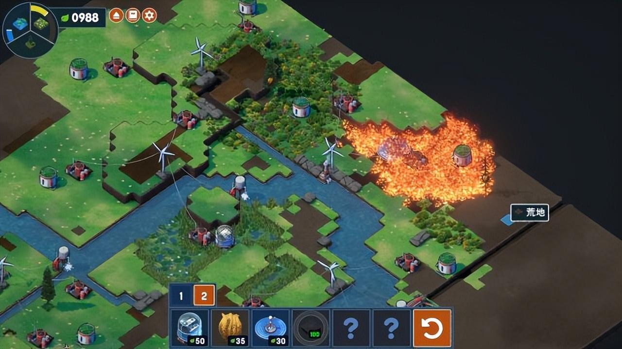 除了这种基础地块的转化,游戏中还存在“二次建造”以及“深度变化”,比如沼泽地需要建造在河边的灌溉机——这就提出了复合化的需求,也让玩家在最开始铺设灌溉机时,就需要更多的为后续的进一步改造做考虑,类似的还有蜂巢需要挂在松树上等等。而类似于草地这种已经改造完成的环境,还可以用太阳能设施放一把野火——野火会把没有山坡和河流隔断的绿化焚烧殆尽,但是也会留下养分丰富的草木灰,可以转化为二阶的绿化设施(游戏一共包含了三阶绿化设施,一阶是基础变化、二阶是进阶&复合变化、三阶是回收&动物相关)。
