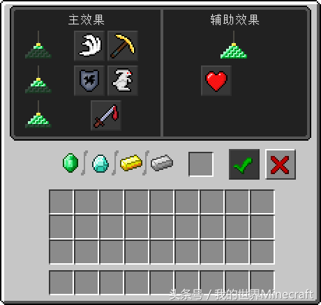 选定了增益效果之后,放入一块指定的矿石,点击绿色的完成键,你就可以获得由信标提供的持续增益效果啦!