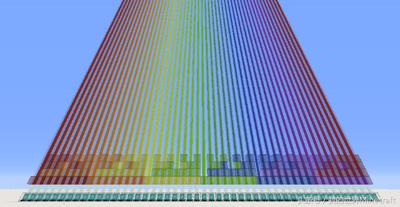 除了以上这些实际用途之外,使用信标搭配彩色玻璃还能制作出好看的光谱,这是利用了彩色透明方块能够改变信标光束的颜色的原理。如图,叠加多种彩色玻璃方块还能调配出不一样的颜色。