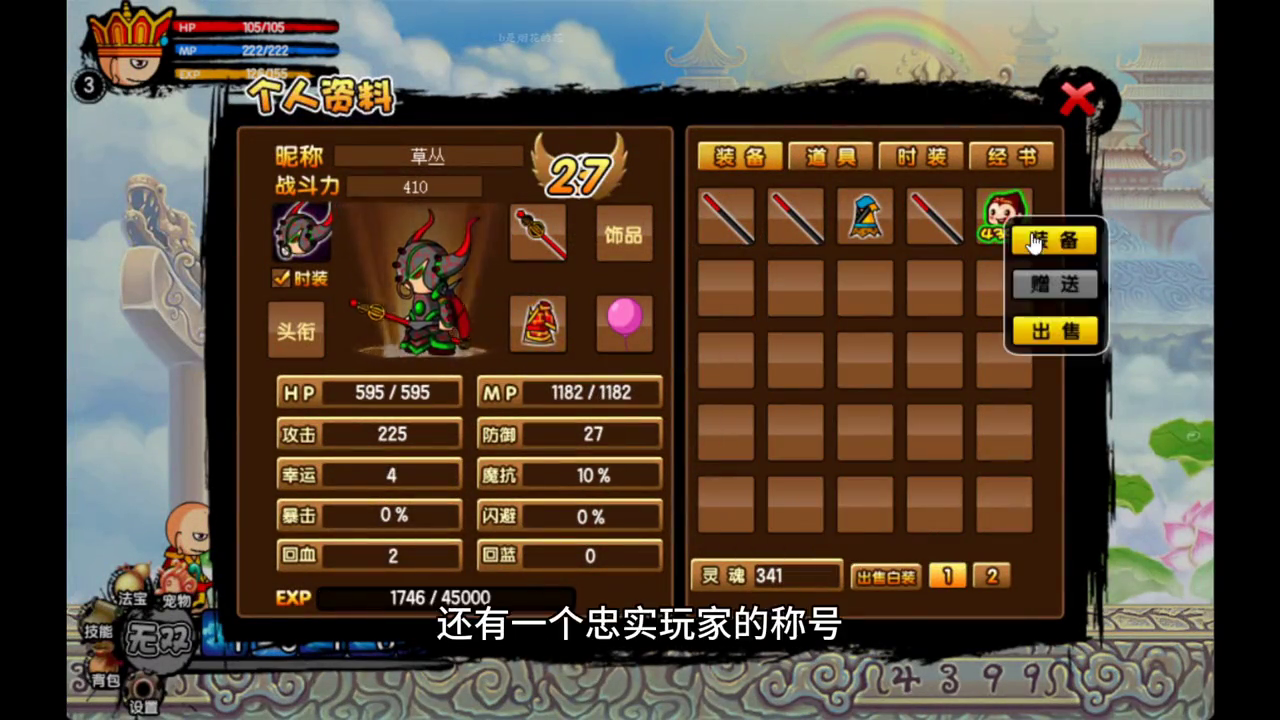 还有这个法宝粉色气球,有什么用?不管了先穿上,还有一个忠实玩家的称号。我现在等级直接来到了27级,现在再来推这张图岂不是简简单单,一个平a带走一个蘑菇头。刚才就是被大眼仔给射死的,现在终于可以报仇了。刚才它俩还爆了件绿色品质的武器,来穿上。下一关的boss是巨灵神,也是非常轻松的就拿下了。