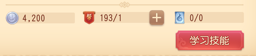 少侠可点击【技能】进入【帮派】页签,使用帮贡、银币和帮派资材学习帮派技能,当然,前提是少侠已经加入某一帮派。可升级的技能等级上限与帮派该技能的等级有关,且随着技能等级的提升,升级所需的材料数量也会逐渐增加。