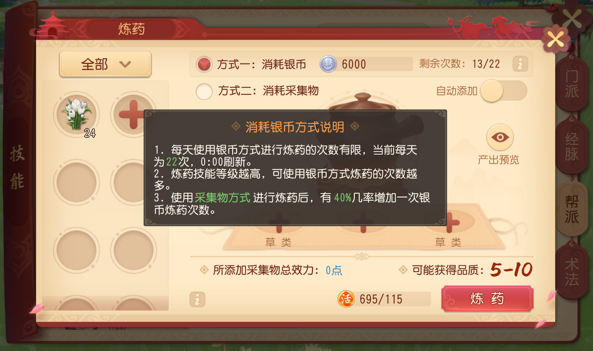 值得注意的是,使用采集物炼药还有40%的概率增加一次银币炼药次数,也会获得中药医理熟练度。虽然有点耗时,但还是比较推荐新手选择这一方法的。