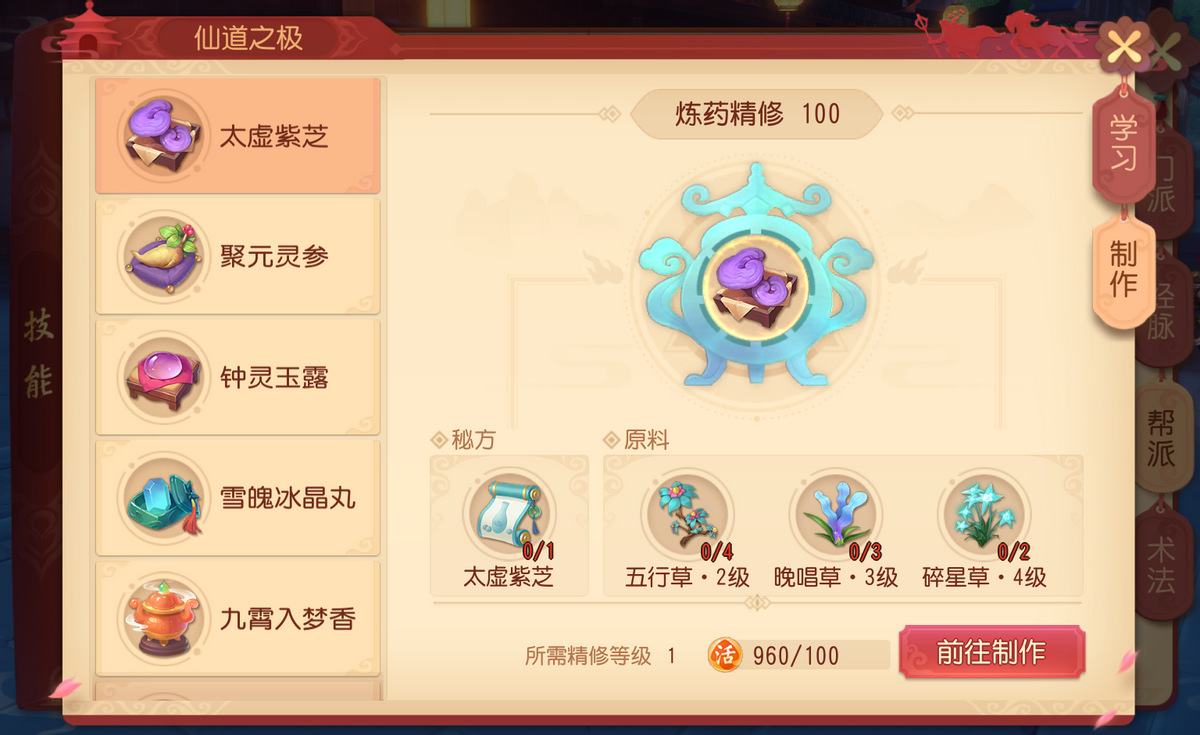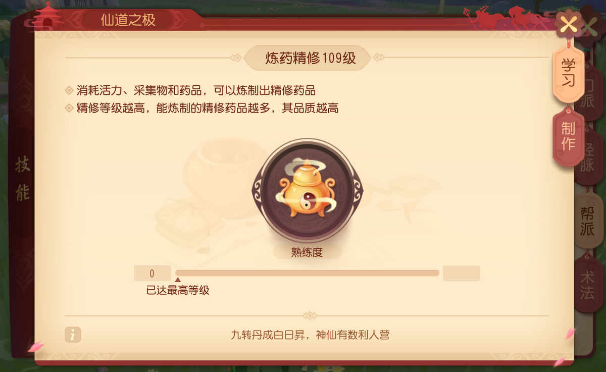 刚开始的新手不用执着于精修,毕竟精修需要花费的人力财力时间可想而知,并不适合新手;大家可以着力于提升帮派技能等级及采草/捕猎熟练度,这样之后接触精修也比较顺畅。