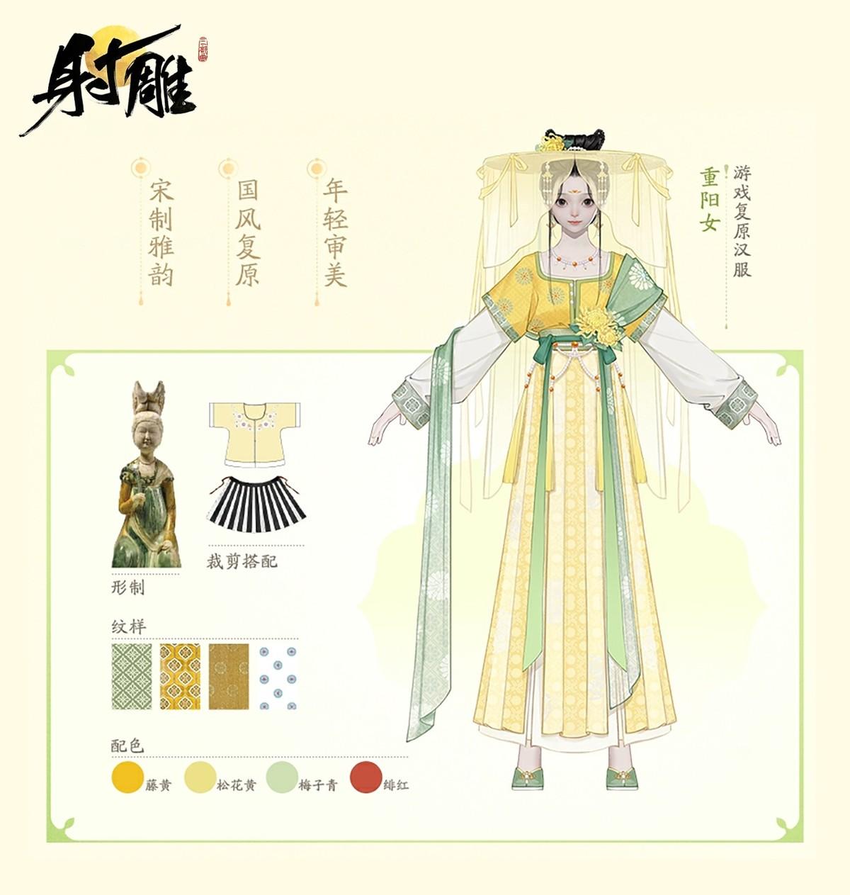 再比如这套复原了唐三彩女座俑的“重阳女”套装,《射雕》参照陶俑原型与文化顾问的建议绘制了形制,更利用故宫博物馆收藏的宋代传统纹样,最终完成了这件汉服的还原。