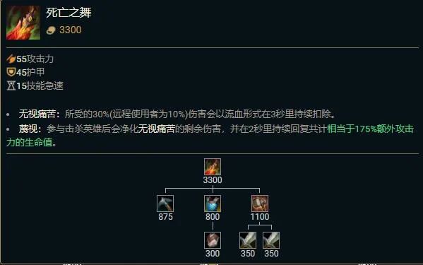 12.3版本死亡之舞改为可储存魔法伤害,且参与击杀回复的生命值相当于175%额外攻击力,并且身上带有护盾时也可以触发存储伤害效果。