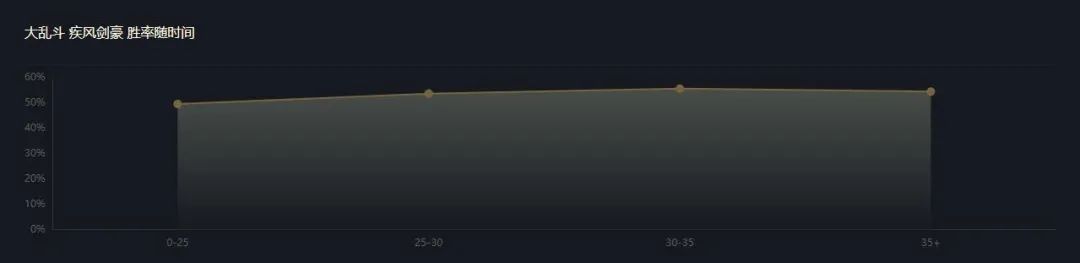 从亚索数据曲线可以看出,亚索在大乱斗中后期胜率显著提升。