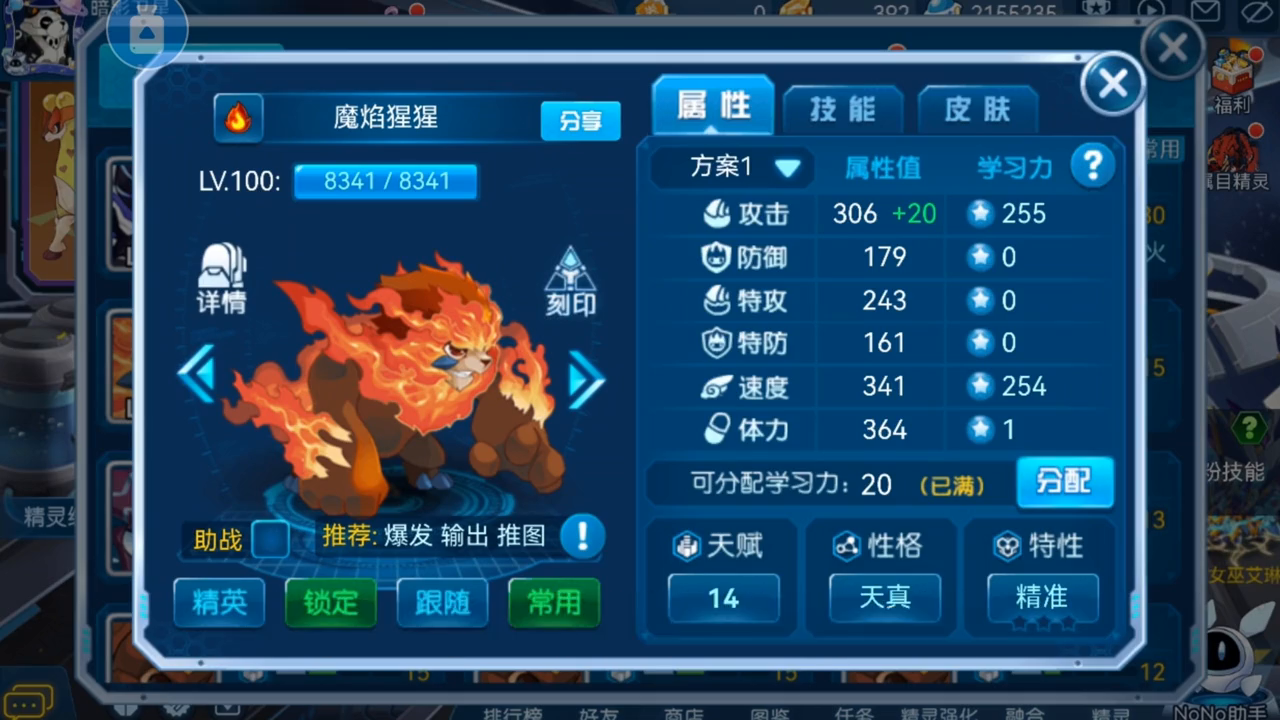 ·接着是魔焰捏捏,猩猩的速度种族值很快达到了114,超越了启航大部分的精灵,所以不能浪费了速度种族值,学习力直接攻击速度拉满。这里不知道当时发了什么神经,去给体力点了一点学习力,这里不用理,直接攻速拉满就行了。性格先选择开朗,我这里的天真是因为懒得洗了。特性可以选择精准或者炎4,回避好像也不错。