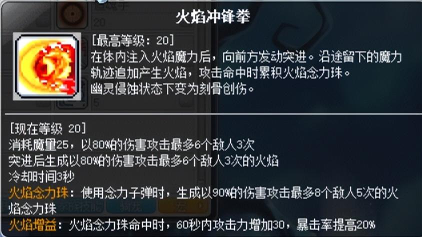 火焰冲锋拳会向前方突进一段距离并造成伤害,并且在路径上生成火焰攻击敌人,火焰冲锋拳命中敌人时,会生成火焰念力珠。