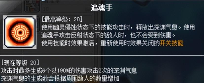 在翼人状态下,冲锋拳一次只会攒1个念力珠,开了这个技能后直接攒满5个珠子,配合自动发射和伤害递增,输出非常可观,幽灵模式下也会提升追魂手生成的深渊气息数量,从而进一步触发憎恶轨迹,幽灵模式下一套爆发这个技能配合追魂手和憎恶轨迹的伤害占比接近50%,是亚克最重要的爆发技能。