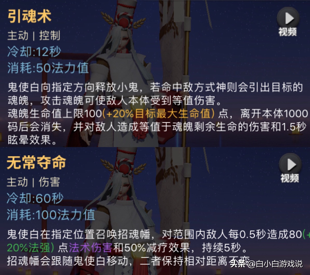 描述:鬼使白向指定方向释放小鬼,若命中敌方式神则会引出目标的魂魄,攻击魂魄可使敌人本体受到等值伤害。魂魄生命值上限100(+20%目标最大生命值)点,离开本体1000码后会消失,并对敌人造成等值于魂魄剩余生命的伤害和1.5秒眩晕效果。