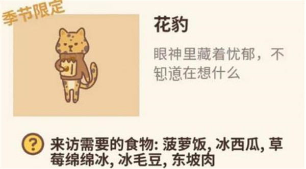 动物餐厅花豹客人要如何解锁?动物餐厅的游戏中拥有超多不同的客人,它们大多在身份设定上是选取自不同种类的小动物,同时也考虑到原型的一些习性特征,所以游戏中的每一种客人在口味和用餐要求都不同,这也导致了招揽条件的不同。游戏中的客人都是小动物,除了喜欢吃的食物口味风格不同之外,所会出现概率和剧情互动也不同。而其中的花豹客人就是一位很特别的存在,是一位看起来眼神忧郁,但又夹杂着温柔气质的客人,除了和玩家的互动剧情特别之外,还会有可能给予动物餐厅许多特别的纪念品小物件。而每一位客人在游戏中性情喜好和解锁条件是息息相关的,需要准备一些特定的食谱和装饰品,就此小编带来花豹客人解锁方法介绍和大家分享,快来一起看看吧。