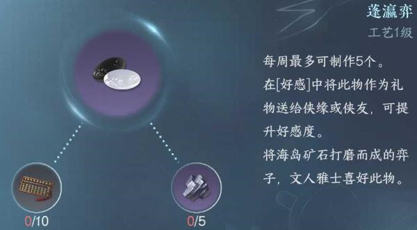 逆水寒手游蓬灜弈的获取方法是什么?蓬灜弈是游戏中侠缘系统中的一件特色道具,是具备着提升玩家和特定名侠之间好感度的物品道具,并且也是游戏还在那个新增的一种,让玩家在选择赠礼上有着更加丰富的选择。蓬灜弈是一种包含匠心的物品,是利用来自东极海的特色海岛矿石而打磨而生,是一种特制的弈子,有着文人雅士之气,玩家在游戏中作为送给大师兄叶问舟或是小神候方承意都是不错的选择。玩家在侠缘系统中的投入可以帮助玩家提升和名侠之间的好感度,这样玩家与之同行的江湖游历的收获会更多,并且后期的特定同行任务也会更加方便,使得玩家在一些挑战中更轻松,而游戏中的每一件侠缘物品都是制作的,就此小编带来蓬灜弈的获取和制作攻略和大家分享。
