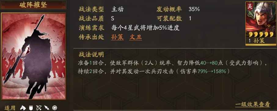 传承战法破阵摧坚,之前在将文丑的时候就介绍过,属于比较优秀的战法,能使敌人降低统率和智力,从而提升敌人受到伤害,158%*2的伤害量也比较高,从S1开始就开始被使用,唯一的缺点就是发动率低、容易被打断,因此时常给具备洞察技能的赵云带效果十分不错。