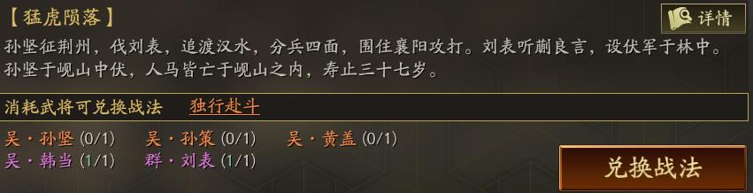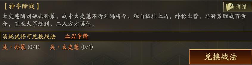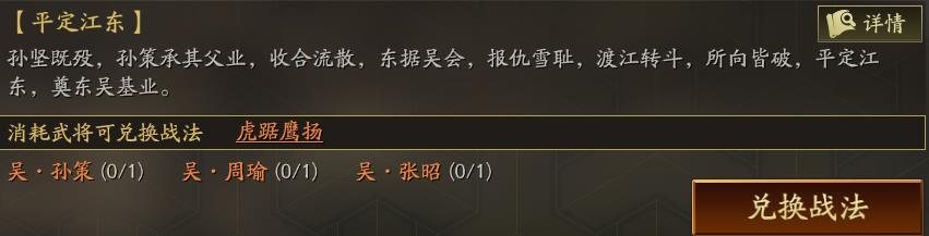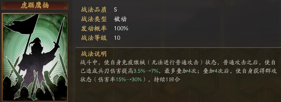 平定江东是孙策的一生功业所在,没有他的前期铺垫,也不会孙大帝50多年的虎踞东南。兑换的事件战法虎踞鹰扬,是缴械类战法的克星。100%发动,可以让携带武将有效避免被罚站。普攻后使自己造成兵刃伤害提高7%,最多叠加4次可达28%;并在叠加4次后,使自身获得30%群攻。一般虎踞与裸衣或血刃搭配,受益更强,孙尚香、夏侯渊等是不错的人选。