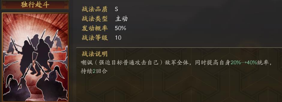 独行赴斗的事件战法出来有些年头了,可惜本人受制于卡牌不多,一直未能换取。50%的发动率,在35%面前绝对的实力派,嘲讽敌军全体,同时提升自身40%的统率,似乎比唇枪舌战、守而必固、挑衅等同行都要强些,比较适合夏侯惇、程普、典韦这类反击流武将携带,坦度高,可以防止武将暴毙。