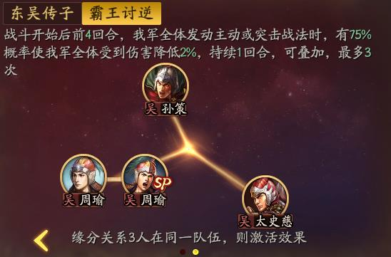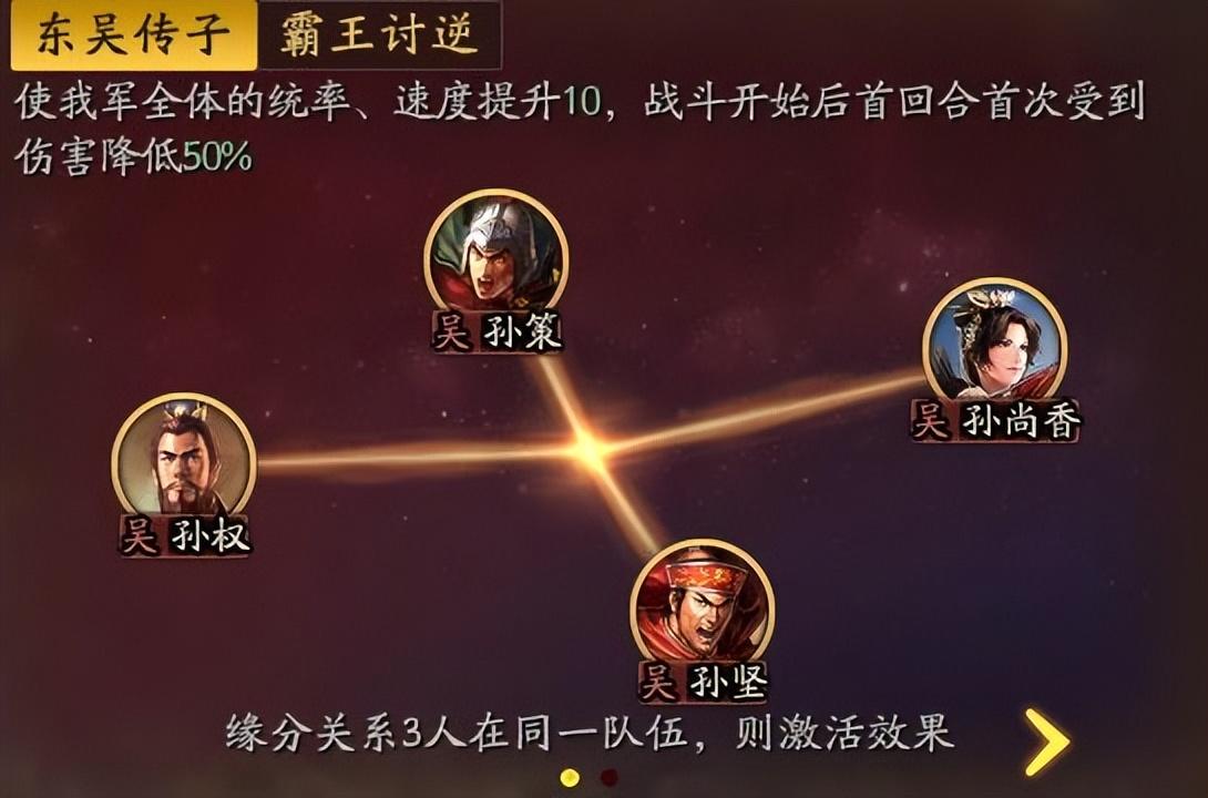 孙策的第一个缘分是东吴传子,就是孙家四人组,提升全体10点统率和速度属性,首回合减伤一半。整体上效果马马虎虎,说得过去吧,只是这四位选手纯纯攻击流派,刚柔不能相融,很容易被缴械制裁,即便是带上虎踞也只能保护一位,实战上几乎见不到。