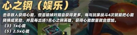 心之钢:击杀敌人获得心能,但是输掉对局会获得更多,每与玩家战斗4次就能把心能转换成奖励,并且每出场1名心之钢英雄,获得心能数量就会增加。