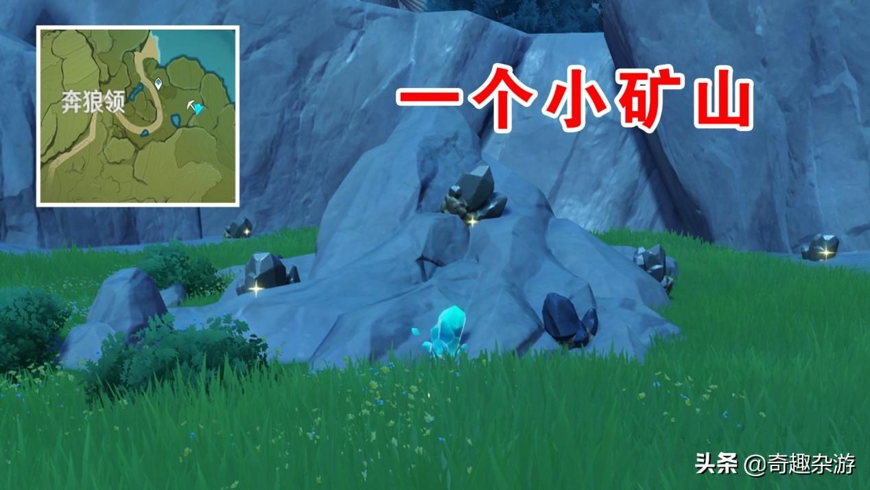 先看一下第一个矿点,这里有小矿山,总共有1个水晶矿、5个白铁矿,还有一个普通矿石。这个位置前期就可以到达,位于蒙德城左边的奔狼领。如果没有开这个地方的传送点,可以直接从蒙德城的高处飞过去。