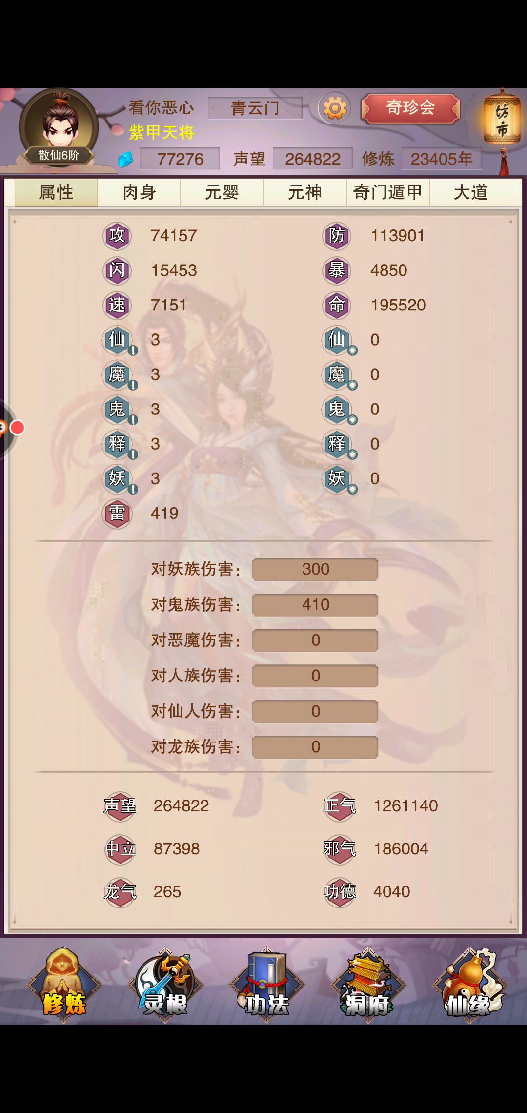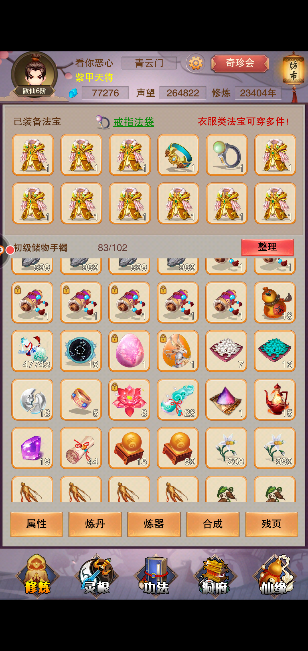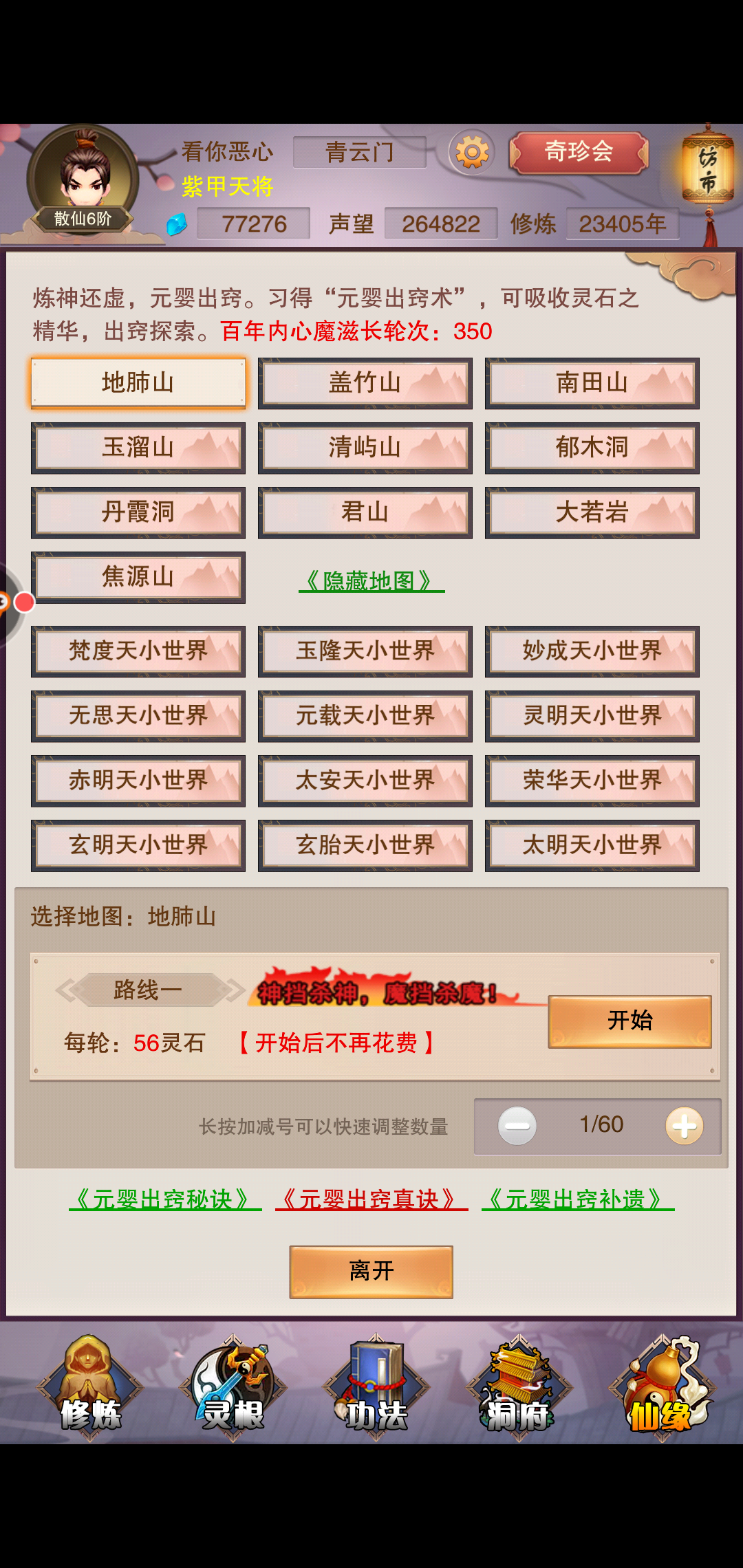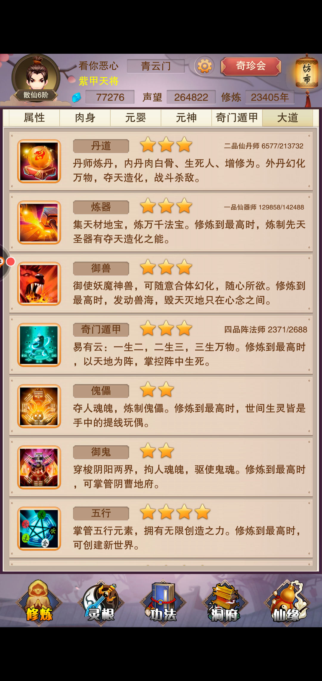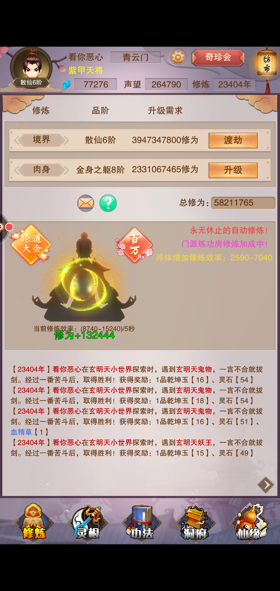 界面什么的我就不多说了,总体就是看出先练速度跟境界,境界的成长对应着修炼速度,修炼速度可以买鬼市的门派书籍来增加,也可以随机拜门派后再学习,有时候系统还送你修炼书籍,反正境界是第一,肉体第二,啥时候境界升不动了就升肉然后就可以了。声望可能前期缺点,中间的时候就不缺了,但是后期的时候非常非常的缺,不建议浪费。里面的时间是一天喂一百年。
