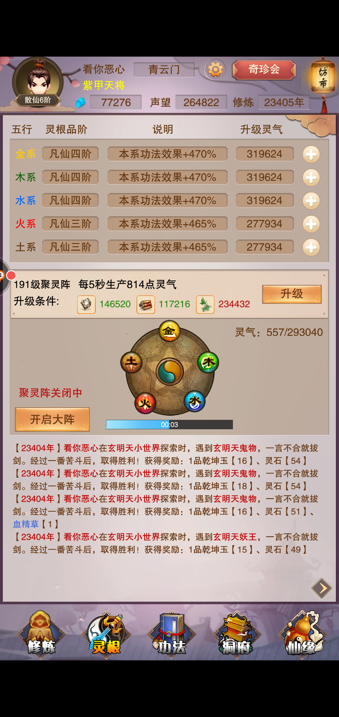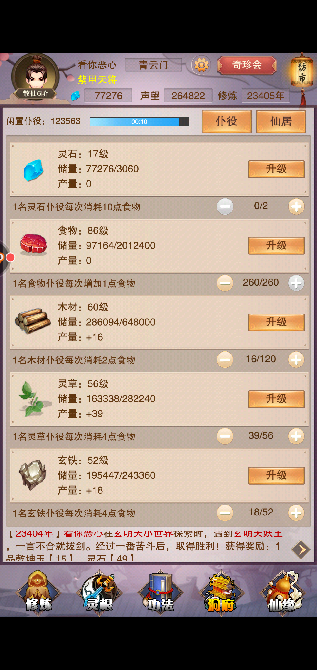 这也是升级聚灵阵跟洞府里的洗髓池和仙兽池的资源,每十秒钟加一次,但是我建议大家前期升级木肉,只有木肉高了剩下的就可以快速升级放置。