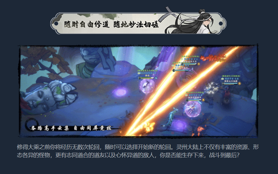 从目前Steam商店推出的页面内容来看,游戏是立体的,属于国风仙侠,美术品质较高,游戏界面也干净,非常符合小编的审美。视频中展示的人物、boss、技能特效看起来有点东西,这游戏宣传的第一个特色是【随时自由修道,随地妙法切磋】游戏易上手,没有日常周常那些常规MMO的繁琐任务,不需要打卡上班肝进度,轻松无负担。在游戏内,玩家可以打坐修炼、野外采集资源、开宝箱、刷小怪,总之通过各种方式让自己快速升级,随时加入战斗。
