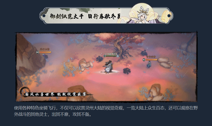 游戏第二大特色也是最吸引小编的特色是【御剑纵览大千,日行春秋冬夏】,要说一提到仙侠修仙,必不可少的那就是御剑飞行,这游戏居然真的把御剑飞行做到了游戏里,就你们玩真的是吧?MMO多人同屏御剑,小编已经可以想象到那场面有多壮观了,2月1日开服必要约上好兄弟炸裂出街变换各种队形!目前了解到飞行状态下视角是整个屏幕,不但可以闲逛看风景,所有的人物、怪物都一览无遗,还能凑个热闹实时观战看别人怎么打BOSS。运气好的话,看到有人在野外挂机或者打BOSS剩残血还可以落地去偷,实在偷不过可以猥琐撤退直接原地起飞,因为飞行状态下是不会被攻击的,飞行这个功能这不得咱们让“民间的高手们”玩出花来啊?