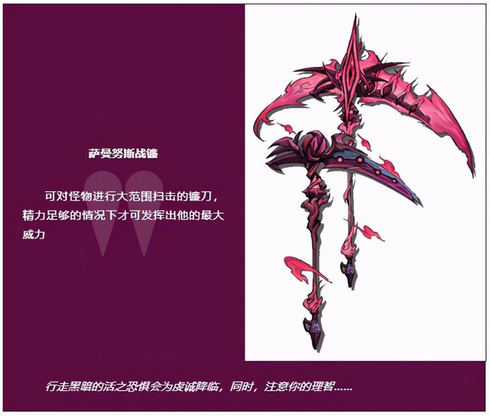 萨曼努斯战镰是一把可对怪物进行大范围扫击的镰刀,在精力足够的情况下,会发挥出他的最大威力。