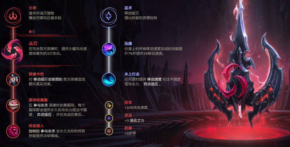 蝎子E技能虽然CD高,但是只要打出了后续的晕眩或者使用R技能控住了对手,E技能的CD就会减少,实战中打出两次甚至三次恶意中伤收益还是非常不错的。眼球收集器则是提升GANK收益,终极猎人减少大招CD更好打出击杀。副系的选择则是蝎子在被动尖塔附近时还有着移速加成,加上W的加速效果,迅捷的收益非常高。水上行走则是河道有尖塔,对蝎子来说非常关键,水上行走可以有效提升蝎子争夺河道尖塔的能力。