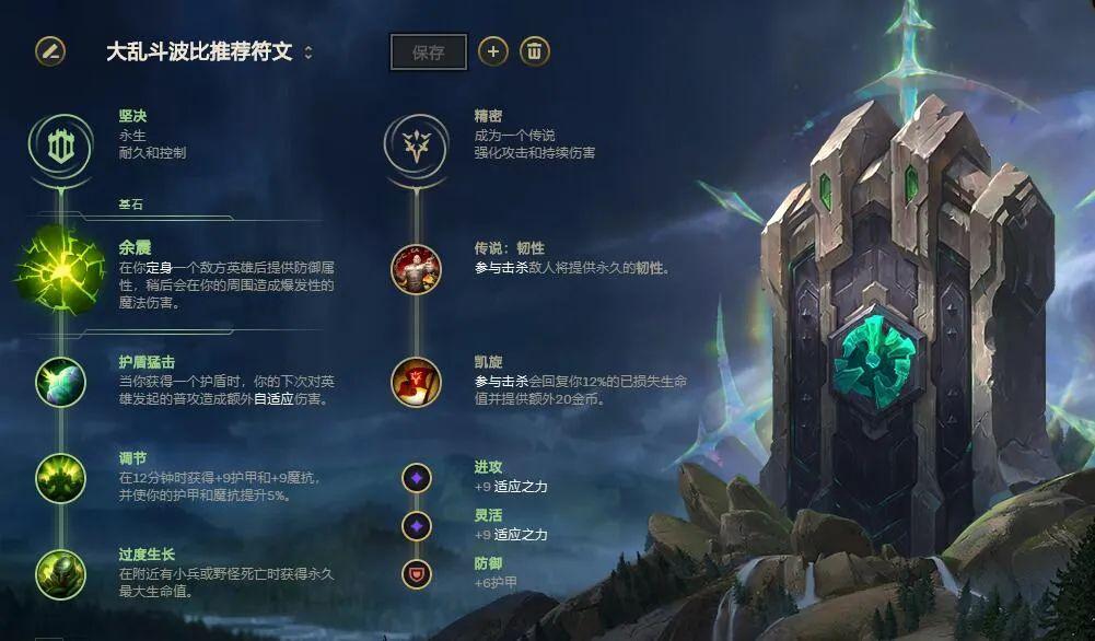 符文解析:波比E技能可直接触发余震,波比打团就是在人群中冲锋陷阵,大乱斗波带余震收益比不灭更高。