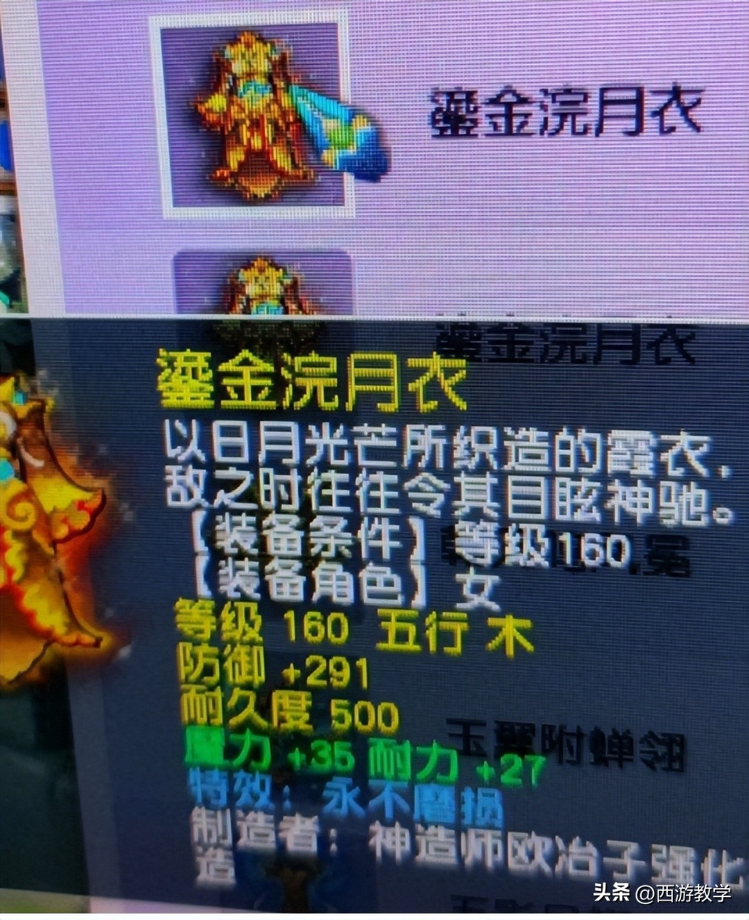 最近新出的一件顶级的160级的女衣,防御+291,魔力+35,耐力+27,特效是永不磨损,这个绝对是任务用的顶级的衣服了,都在没有熔炼的情况下,初防很高,双加也是耐魔双加达到了62,也非常好,而且还可以继续熔炼,这个那个175级的玩家看了估计都会流口水,任务用的神衣呀,真心不错!