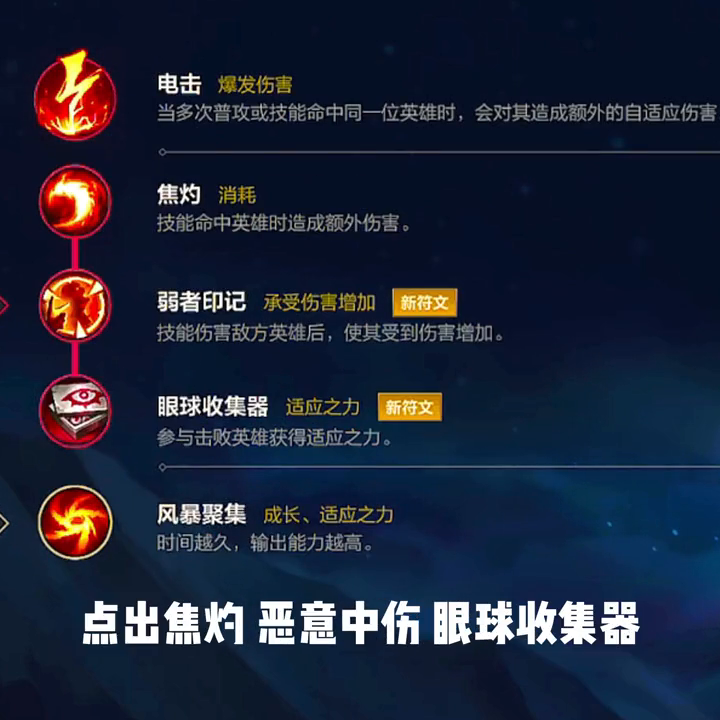 走中单时,可将香味猛冲替换为电击,对线压力小时可保持不变。如果想要在对线期获得更高的伤害,可选择主宰系符文,主要点出焦灼、恶意中伤和眼球收集器。