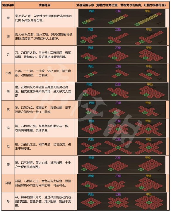 游戏中共有拳、剑、刀、枪、棍、扇、琴等十一种武器,各有所长,具体特点如下,
