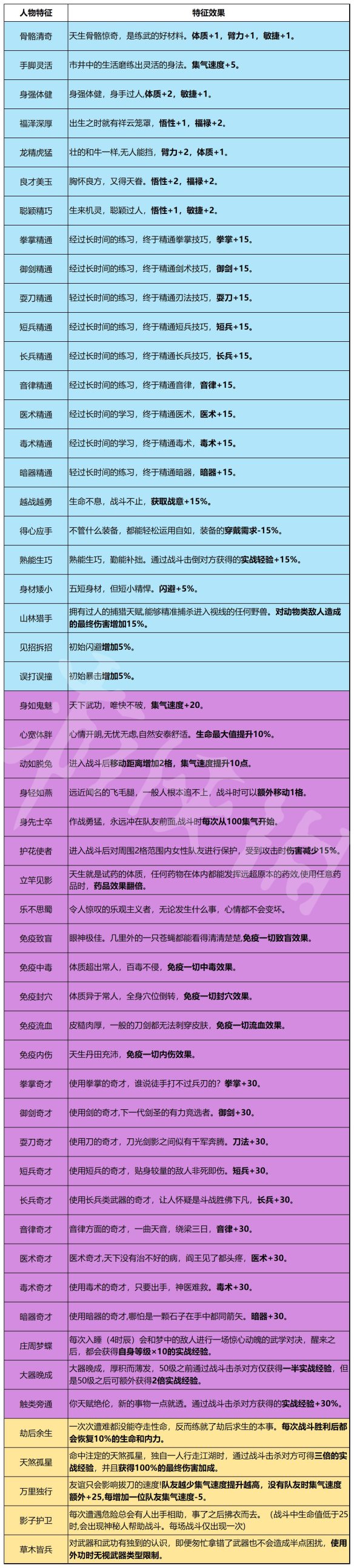 角色初始特性共有蓝、紫、金三种品质,玩家开局可选择有限个数的特性开局。可刷出的初始特性如下。