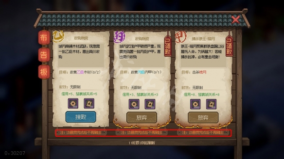 悬赏任务根据难度有甲、乙、丙的级别区分。一些常规的收集、杀敌悬赏都会有时限要求,不能按时完成的话将降低信用以及对应地区的关系。
