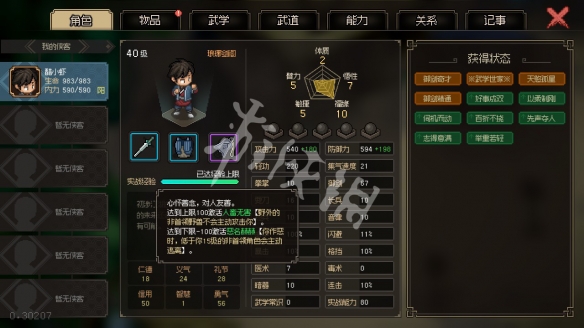 当一项资质点数到达10点时会获得额外的加成,例如臂力为10点时,攻击的最终伤害可提升15%等等。玩家可将鼠标移动到属性名称上查看。