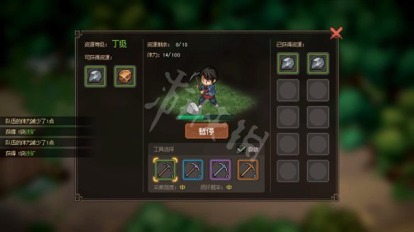 进行采集工作都需要消耗体力,工具也有几率会损坏。能采集的资源数量、种类也都会标记在采集界面上。