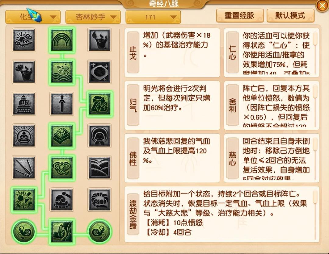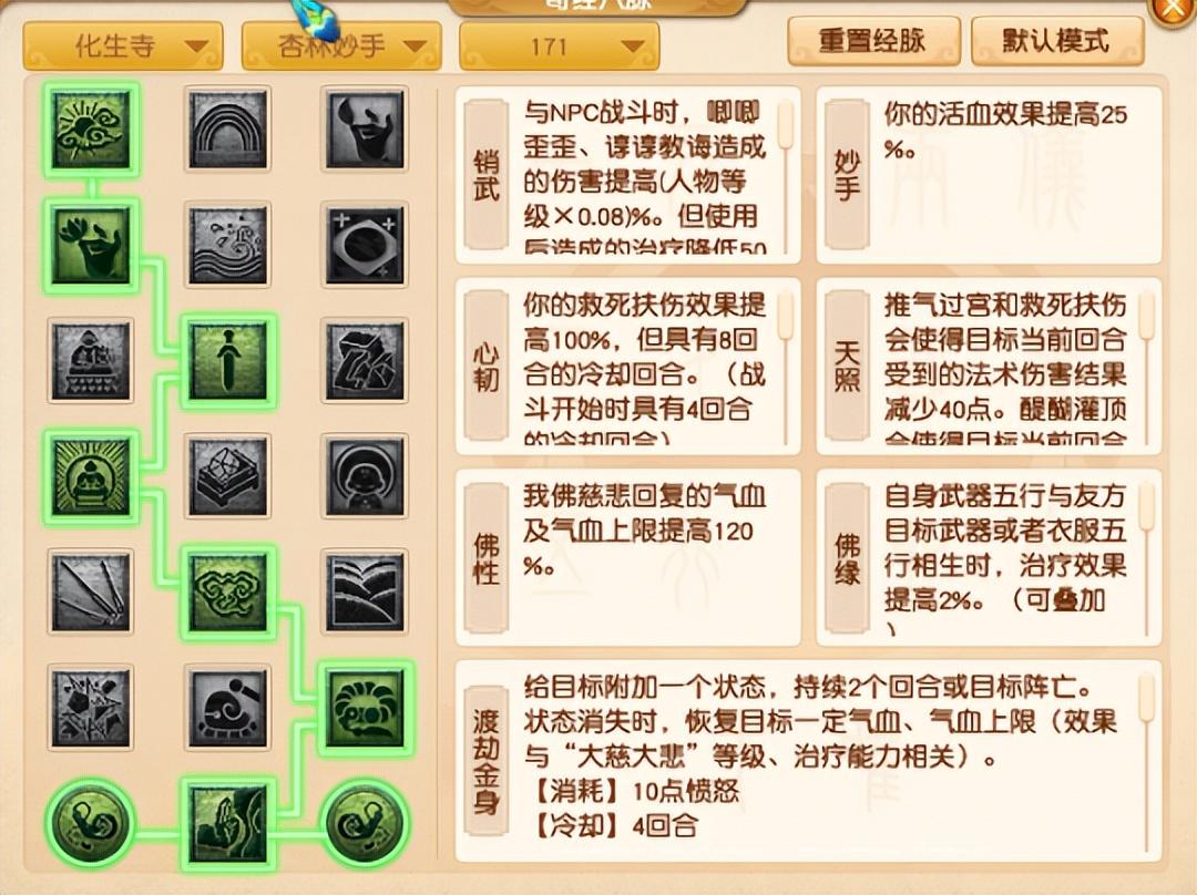 上图是【杏林妙手】主流加点方式,这种加点能让化生寺拥有最大化的治疗量以及保护能力。特别是第2丹的“仁心”,一旦叠了5层,一个活血能让残血队友瞬间满血,是化生寺PK的核心基石。