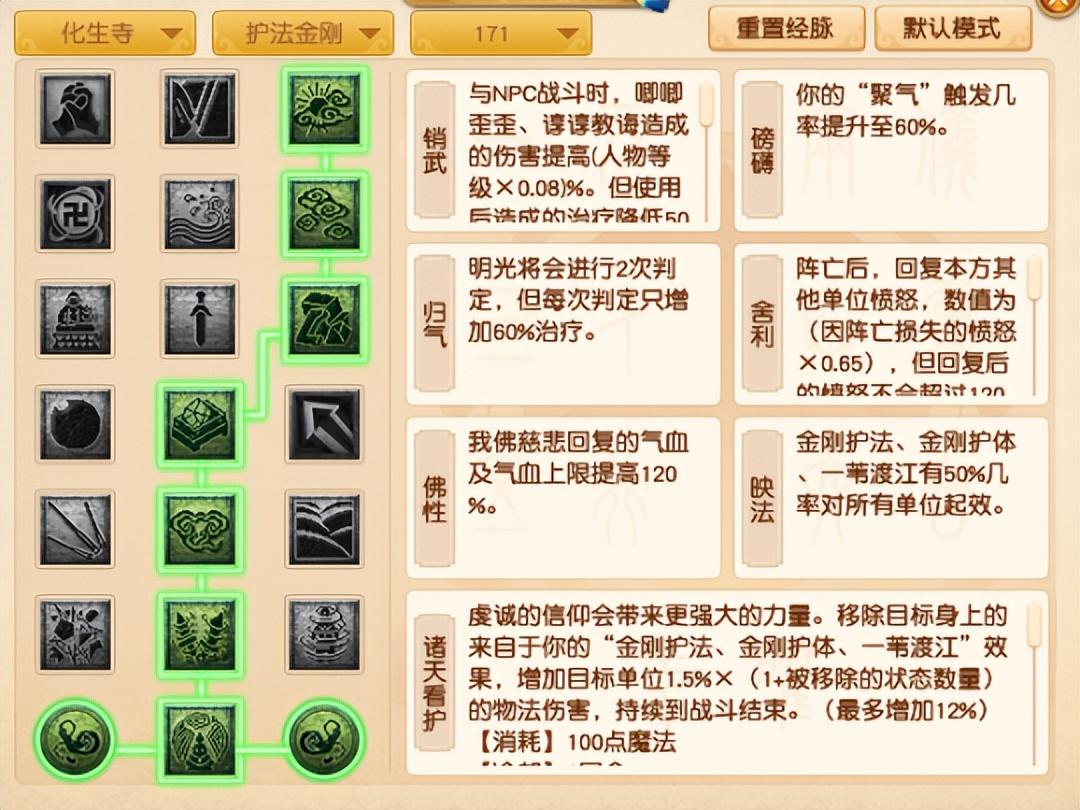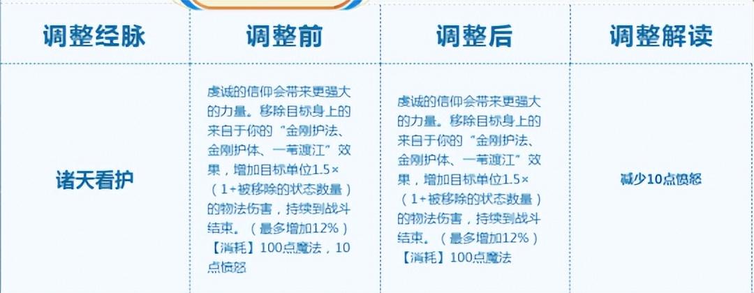 【护法金刚】流派这次改动最小,只改动了第7丹“诸天看护”,在使用技能时把愤怒消耗去掉。这次改动,对于护法金刚流派来说,算是一次小加强。
