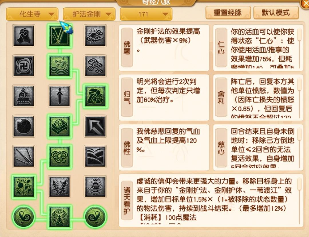 【护法金刚】的PK流加点如上图所示,这个流派的核心丹为第一丹“佛屠”、第二丹“仁心”、第五丹“慈心”。这种加点既能保证化生寺的辅助能力,又强化了进攻能力。第一丹和第七丹的加成,能让我方的物理单位从赛亚人进化成超级赛亚人。