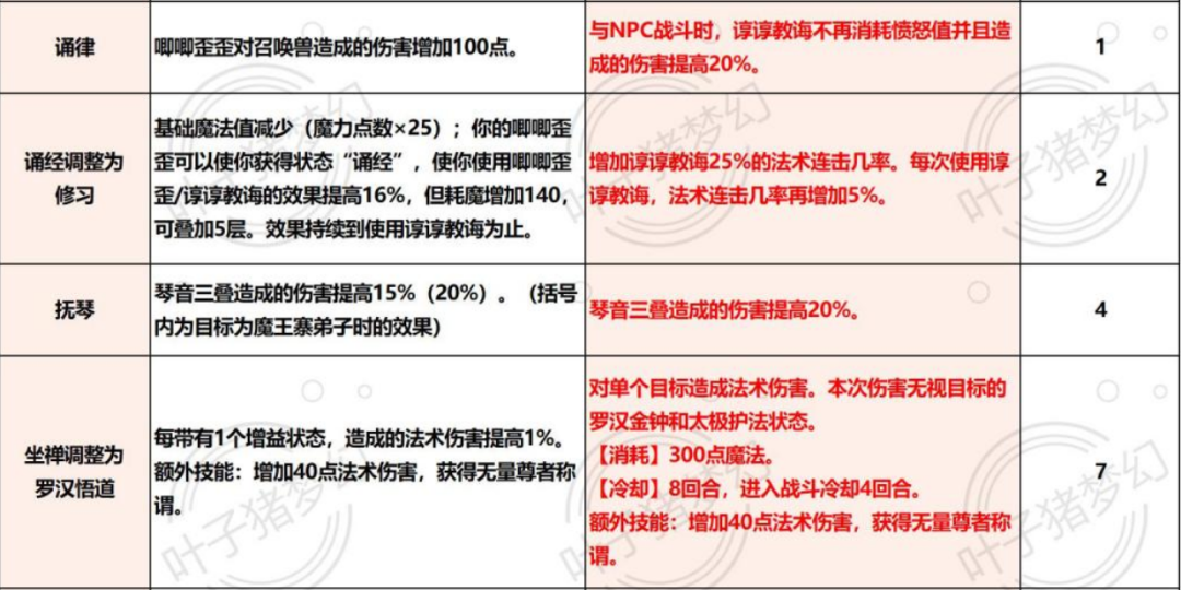 这个流派刷任务的加点,还是有不少套路的,比如第一丹“诵经”和“授业”选择,“诵经”能极大提升伤害,但是要扣除基础魔法以及增加耗魔,挂机不是很方便。如果想要挂机方便,可以选择第一丹的“授业”,增加50点法伤结果。