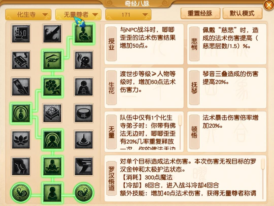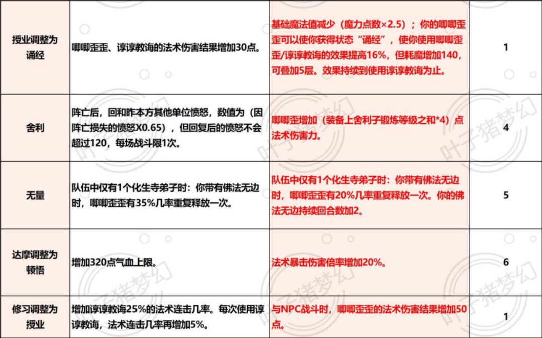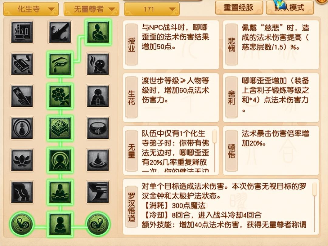 化生寺这次门派大改以【无量尊者】这个流派改动最多,可以说是重做也不过分。这次改动,重点强化了魔化生的任务和PK能力,比如第4丹的“舍利”,可以增加80点法伤(20锻舍利总和)、第6丹的“顿悟”提高法术20%法术暴击倍率。