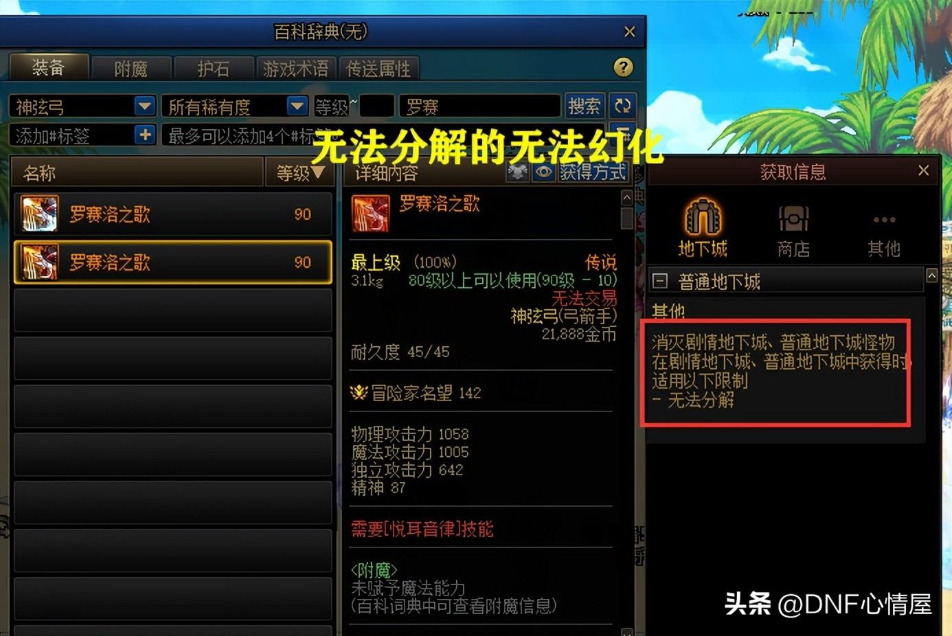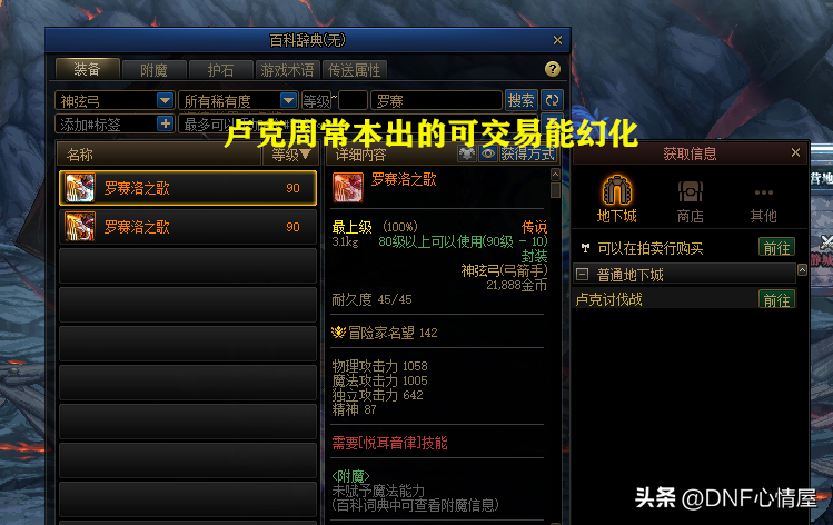 那么问题来了,玄机弓“米斯特尔小姐”和神弦弓“罗赛洛之歌”,究竟如何获取呢?注意了,虽说消灭剧情地下城、普通地下城怪物时,也可以获得,但扣上了“无法分解”的字样,就不能去幻化。