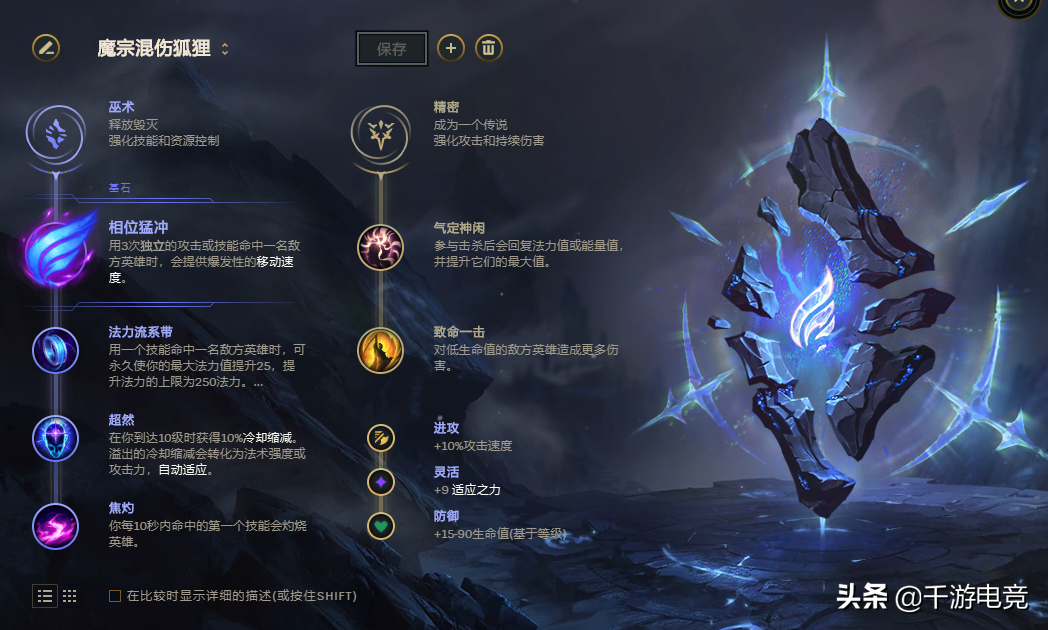 然而就在最近,联盟大神们发现了一个狐狸的最新出装方式:“AD魔宗狐狸”。这种狐狸出装改变了这个英雄常规的输出思路:由技能输出转化为技能、平A混合输出。在该方式下,符文选择相位猛冲、法力系带、超然、焦灼,副系点气定神闲、致命一击,基础符文点攻速和护甲/魔抗。