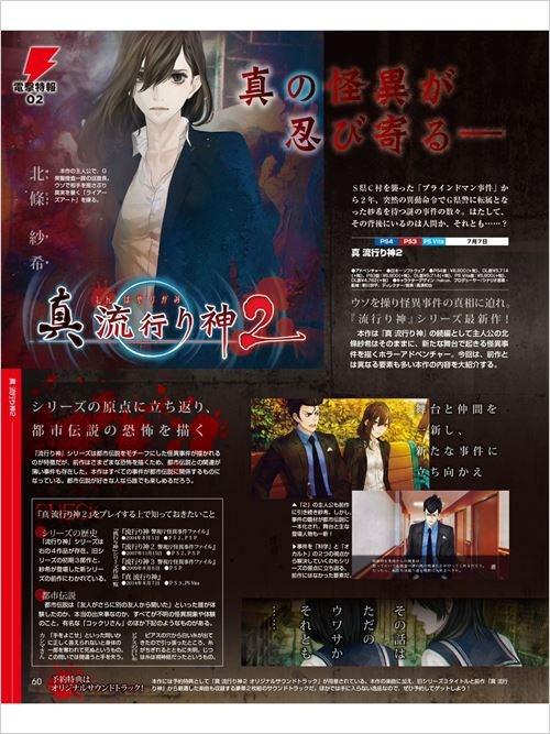 《真流行之神2》是《真流行之神》的续作,同时也是《流行之神》系列的最新作,游戏将于2016年7月7日登陆PS3、PS4和PSV平台。本作是一款描述新舞台所发生的各种怪异事件的恐怖冒险游戏,而前作前作主人公北条纱希仍将担任主角。本期的杂志继续介绍了这款新作,并讲解了本作和前作众多不同的要素。